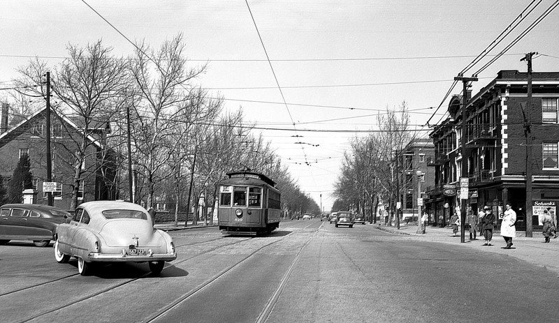 What is unusual about this photo is the 04 CLAYTON streetcar in the photo is not on route. It is pulling out to it’s route. The car line ended just behind the photographer where the motorman switched ends and returned southbound on Skinker to west on Wydown.