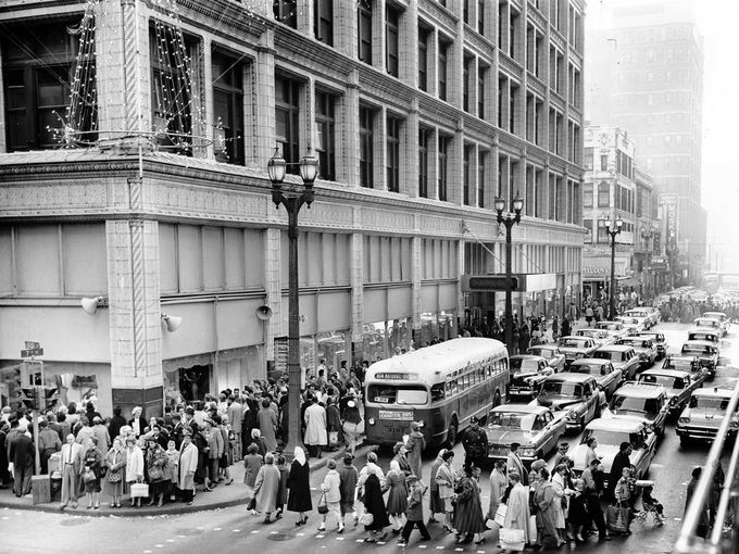 Return to BlogA Public Service bus is seen amid downtown streets that are filled with Christmas shoppers at the intersection of Seventh and Locust Streets outside the Downtown Famous-Barr in 1960.